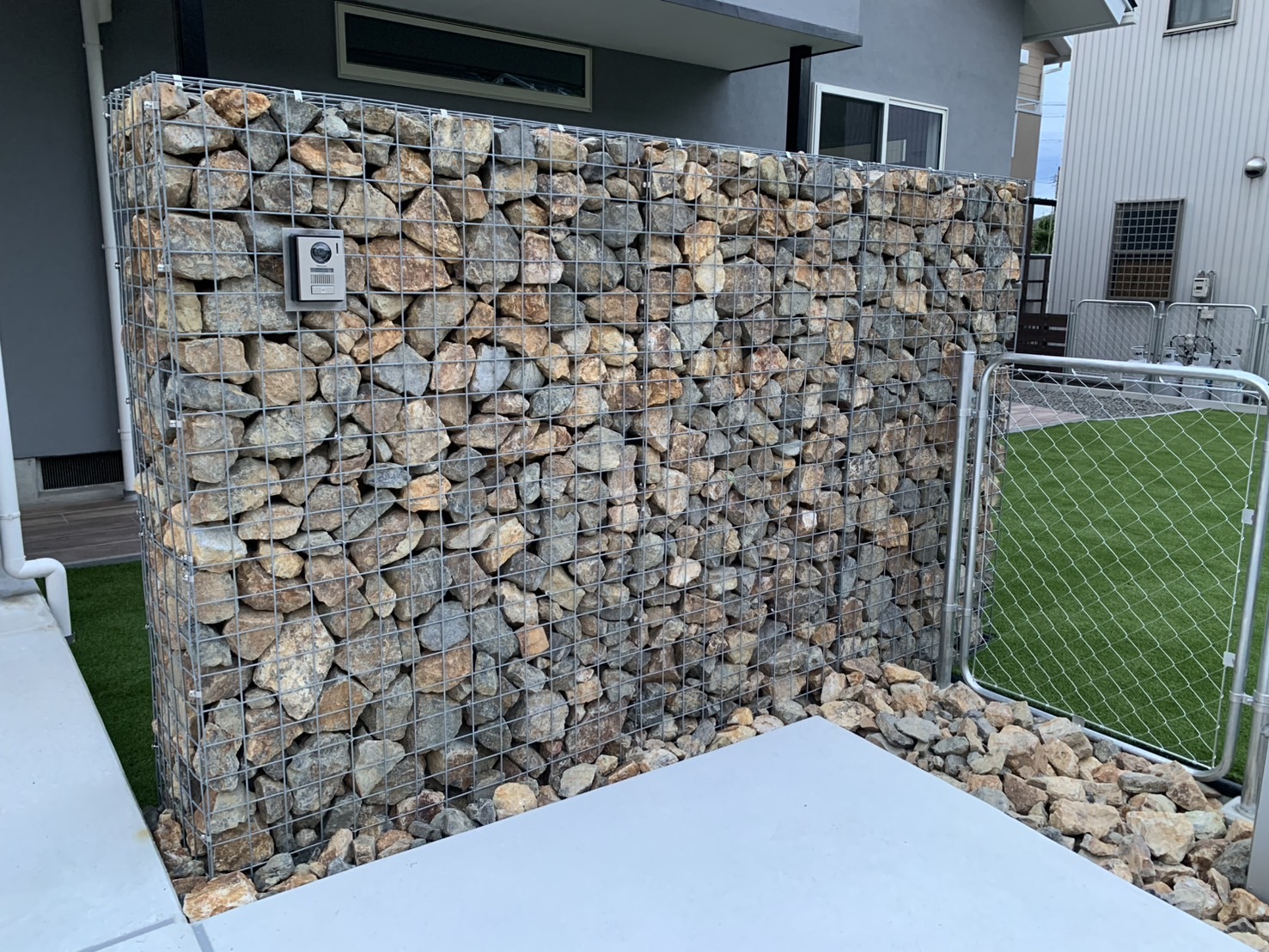 金属のメッシュかごに自然石を詰め込んでつくる構造物のことを指します