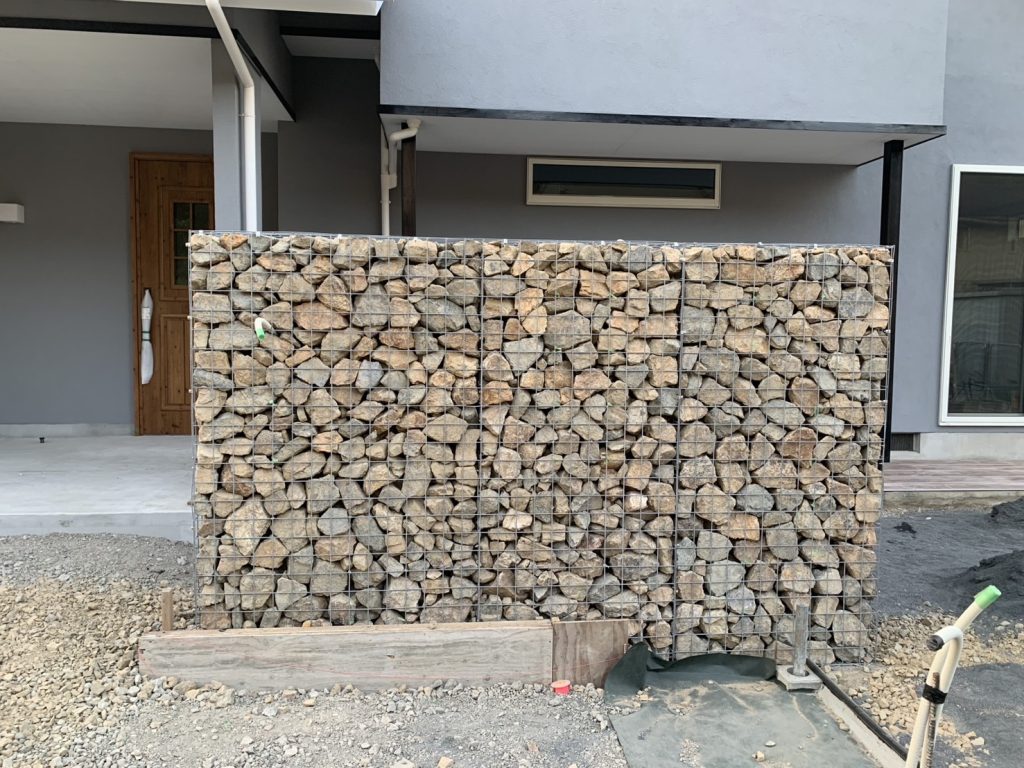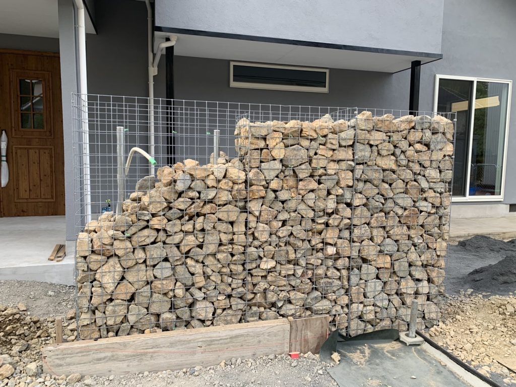 この状態ではまだ“かご”のような見た目ですがここに石を詰め込むことで一気に存在感のある壁へと変化します