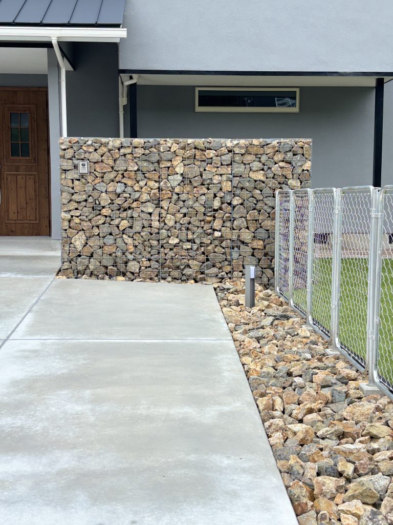 ガビオンや栗石、芝生などの自然素材と相性抜群 無骨さとナチュラルさを組み合わせることで個性的な外構デザインが完成します