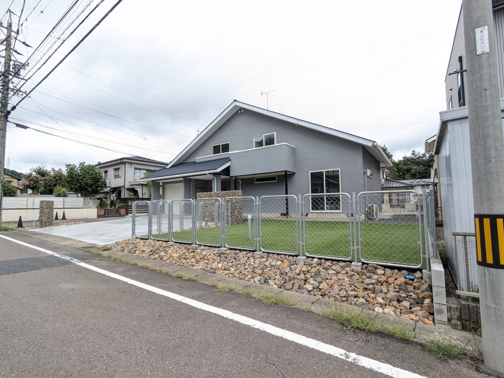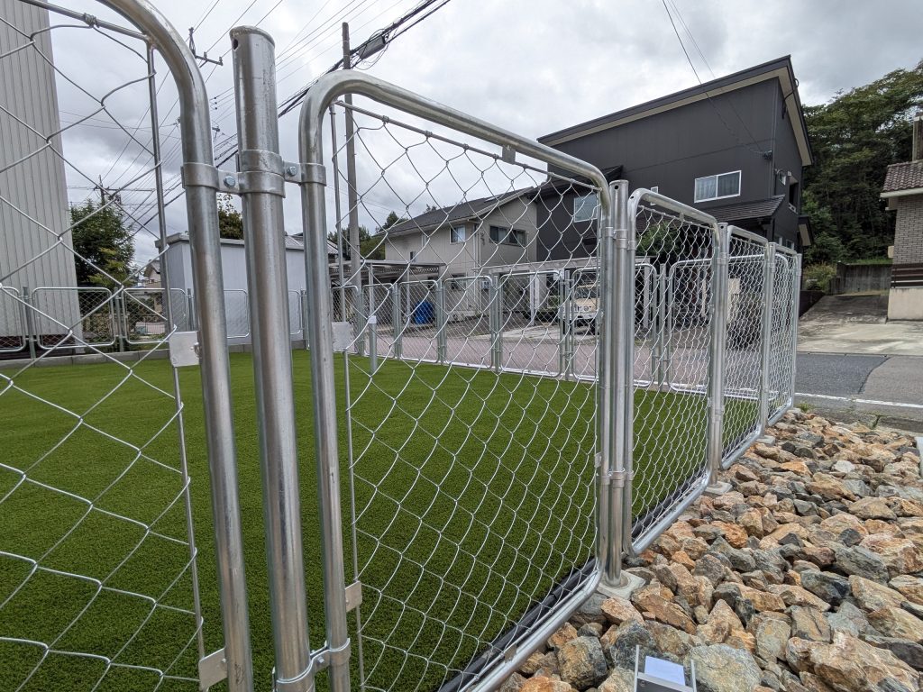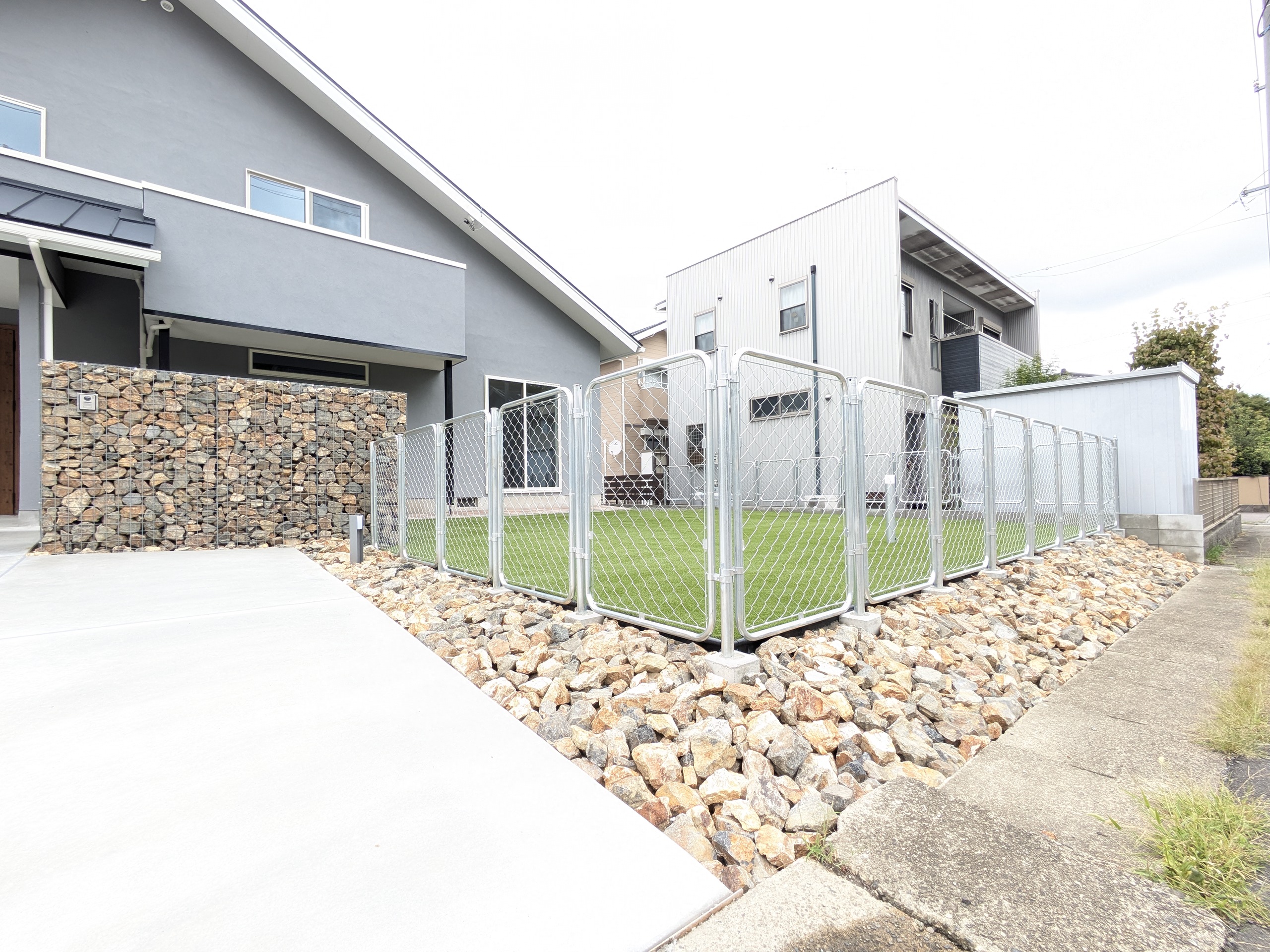 庭一面に広がる人工芝の鮮やかなグリーンは、金属フェンスの無機質な印象と絶妙なコントラストを生み出します