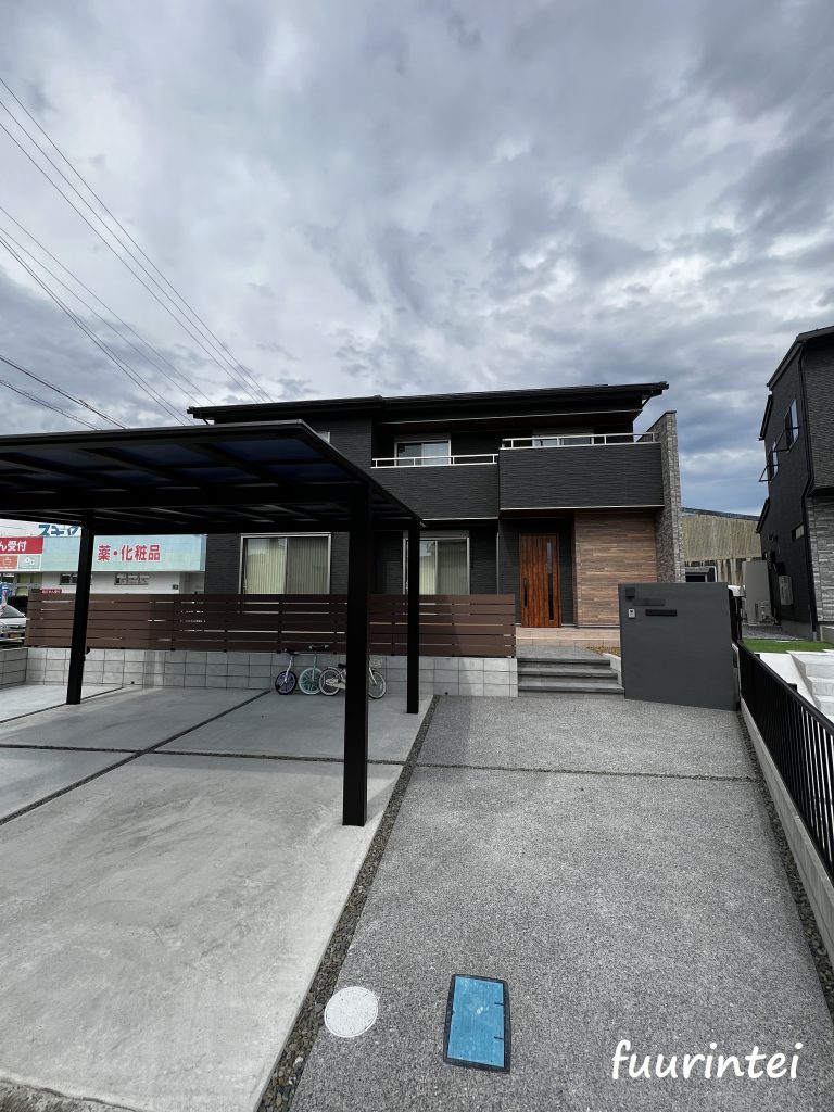 フラットな屋根ラインとシンプルなフレームが、建物のブラック外観と美しく調和しています