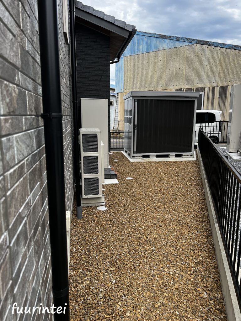 物置下は土間コンクリートでしっかり施工し、周囲は防草シート+砂利で整え、排水性と清潔感を確保