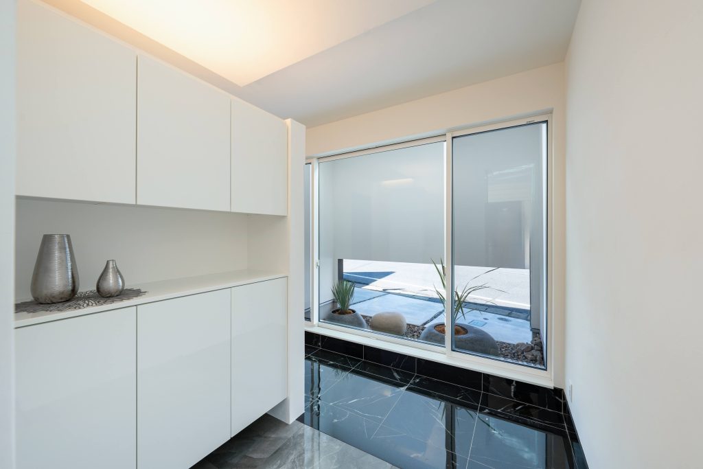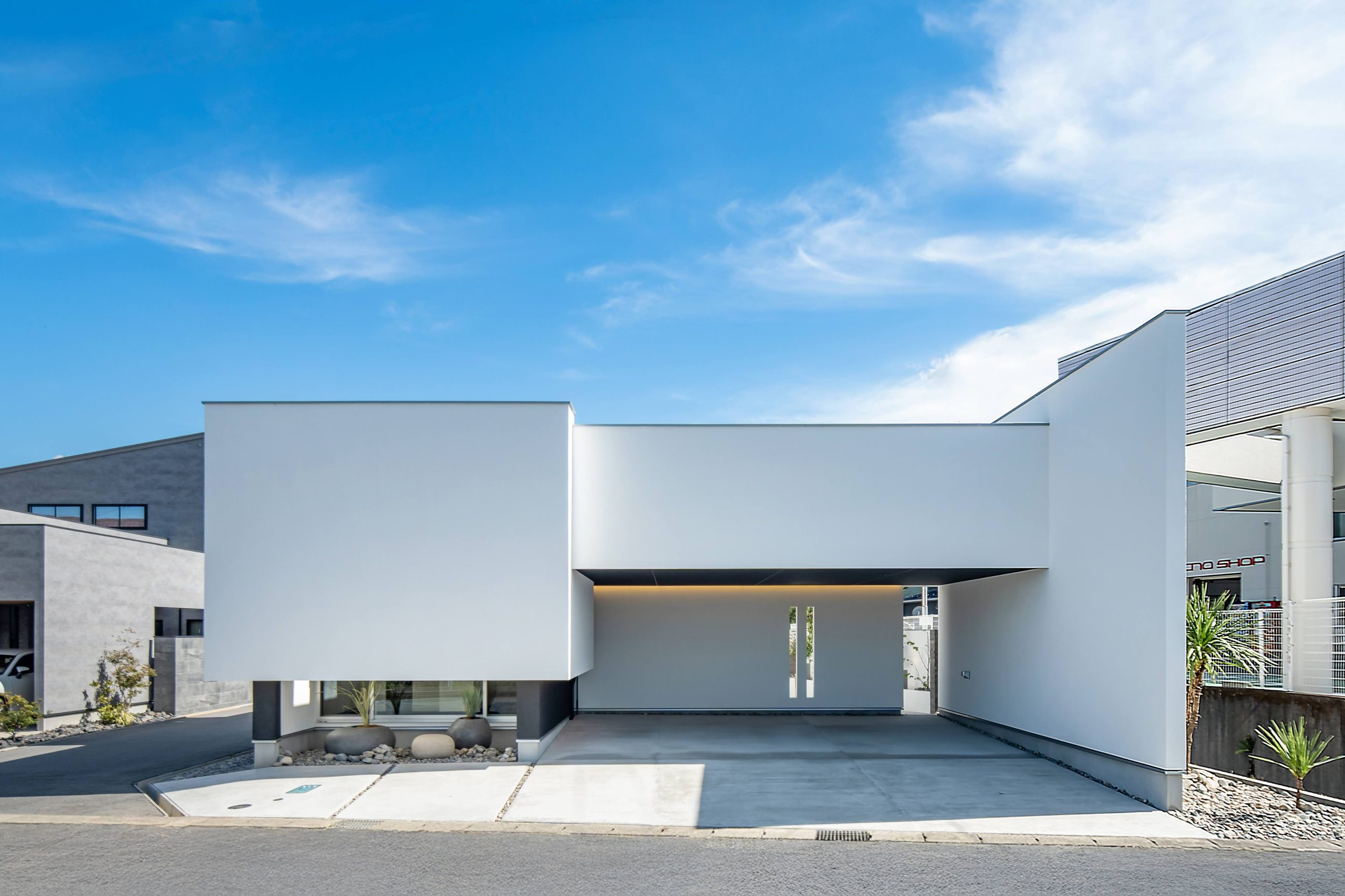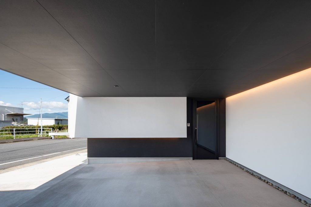白壁と植栽のグリーンの中で、陰影を生むモノトーンの柱が空間を引き締めています