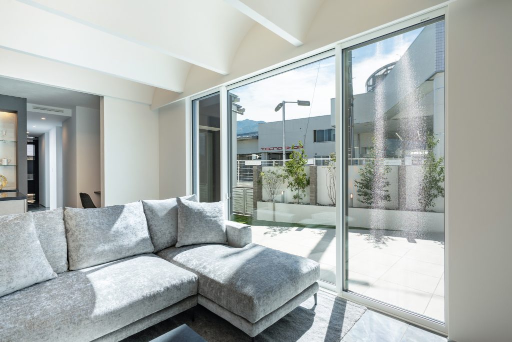 外に出なくても、リビングに座るだけで外の明るさと植栽のグリーンを感じられる