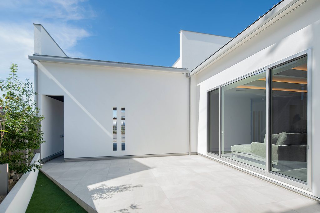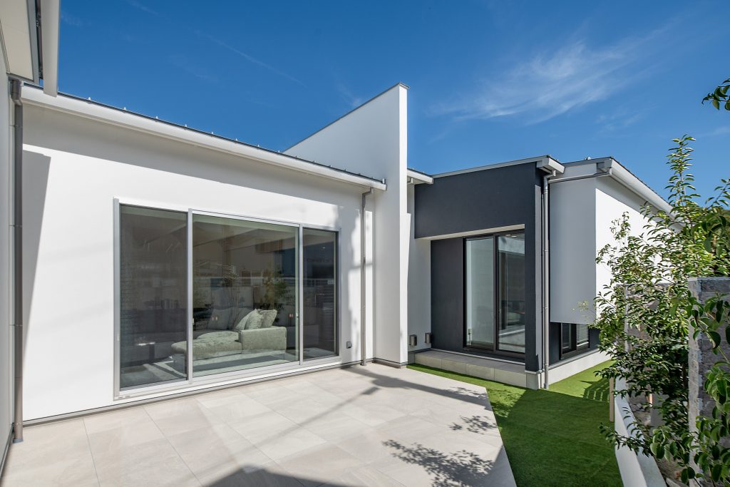 南側の庭は北や東と違い、ぽかぽかとあたたかく住まいの中心に明るさと開放感をもたらす、ホワイトを基調とした中庭テラス