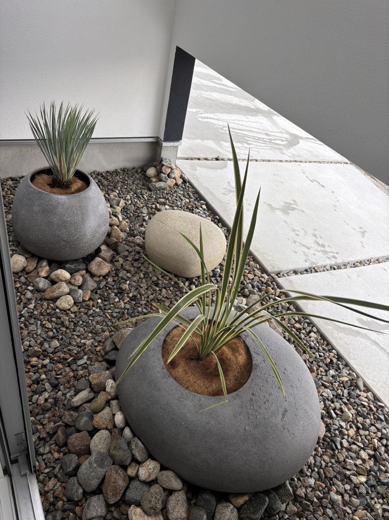 オンリーワンの『コブルプランター』に植栽、足元には小さめから中くらいの栗石を敷きました