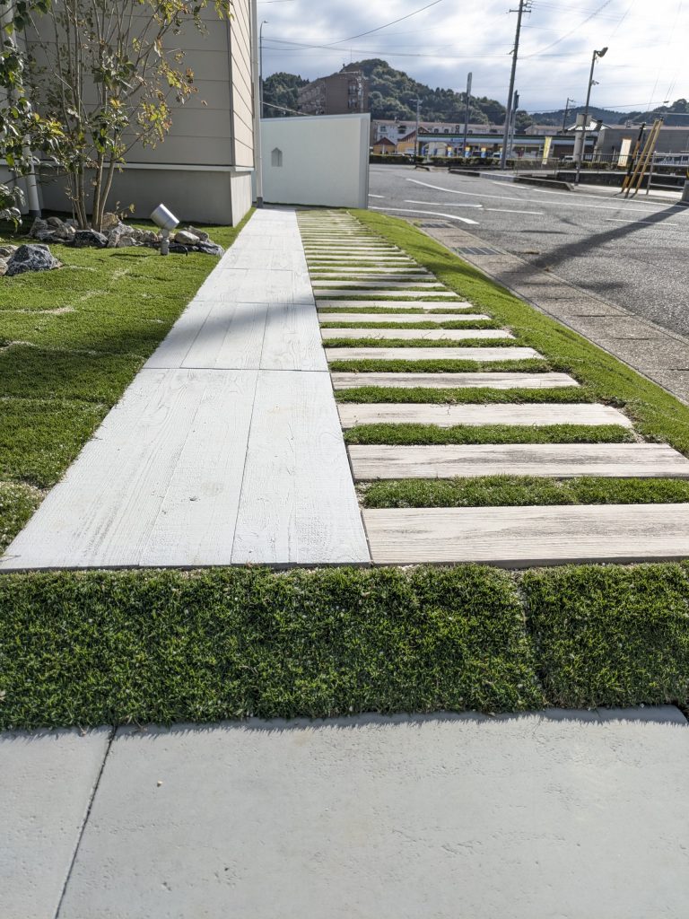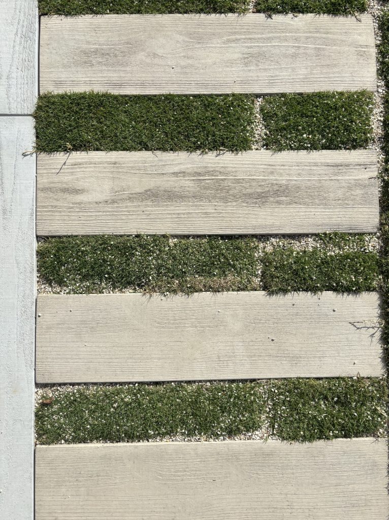 今回の施工で特にこだわったのが、天然芝と木目調コンクリートの交互デザイン