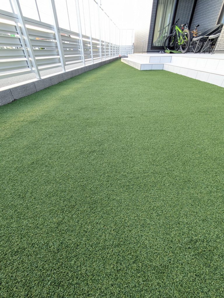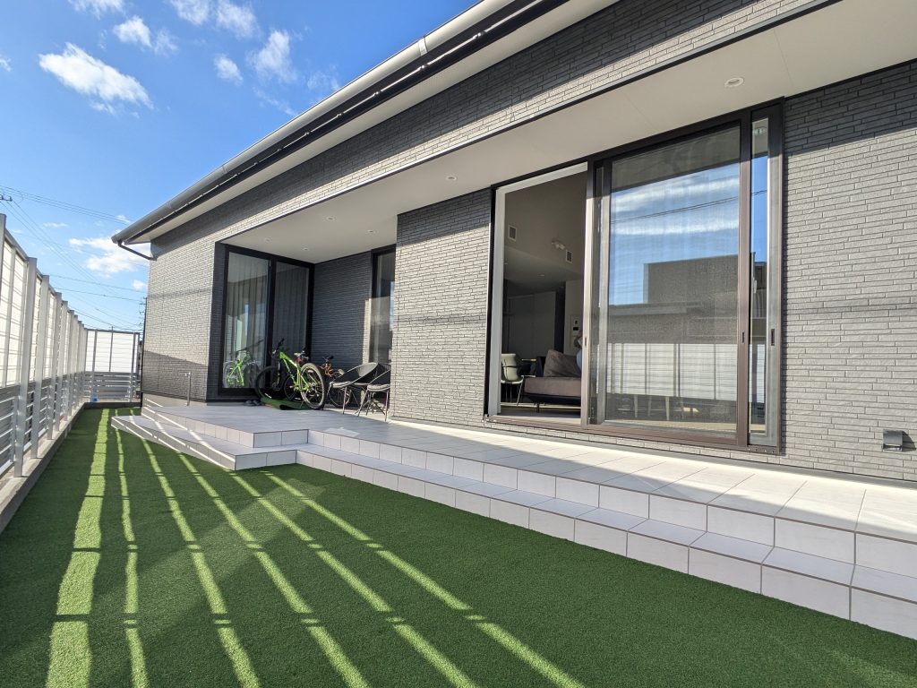 お施主様はまだワンちゃんとは暮らしていませんが、「いつか家族に迎えたい」という想いから、将来のドッグスペースを見据えてテラス前一面に人工芝を採用されました