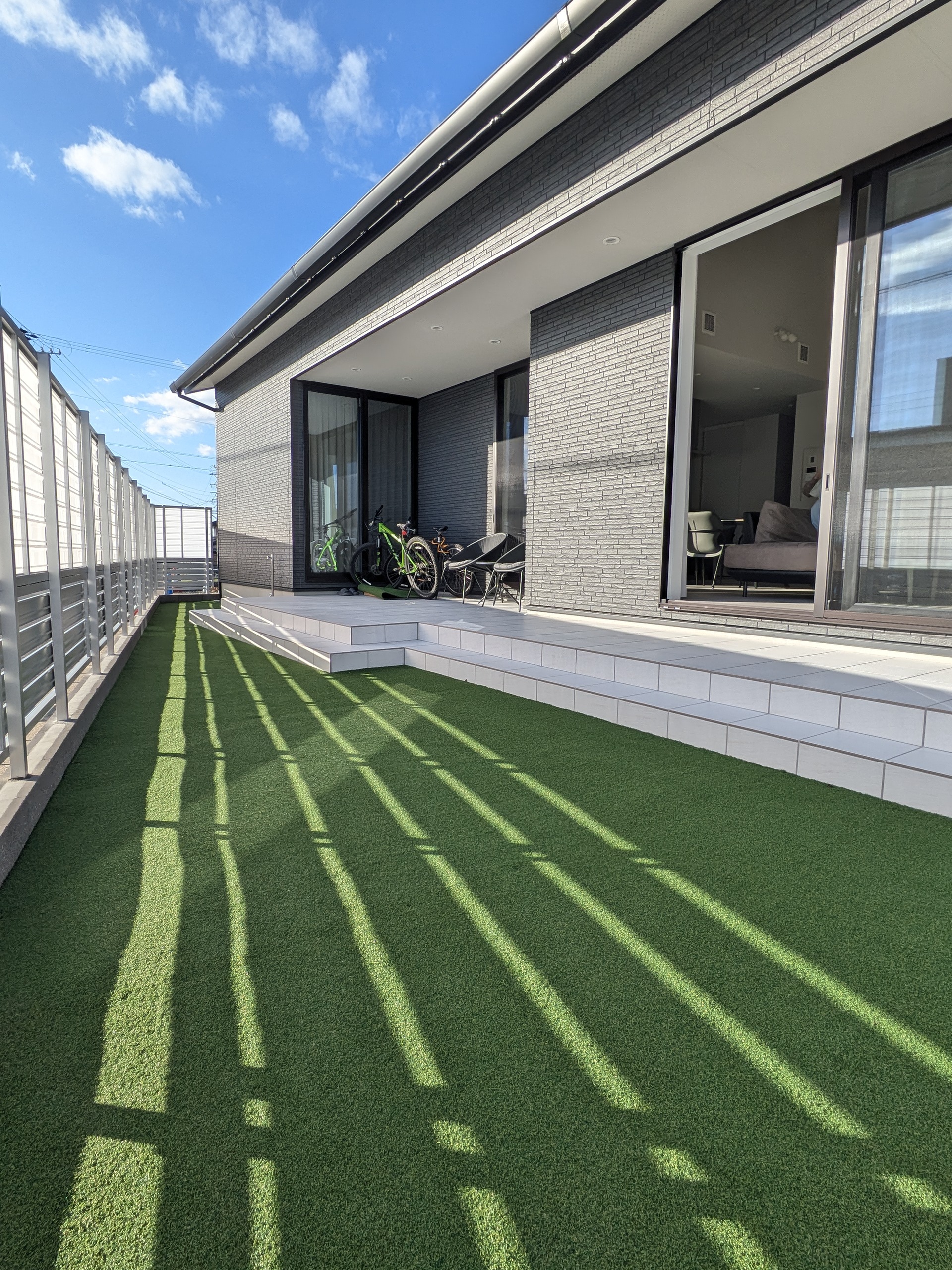 ライフスタイルの変化に合わせて長く活用できるテラス前の人工芝空間に仕上げています